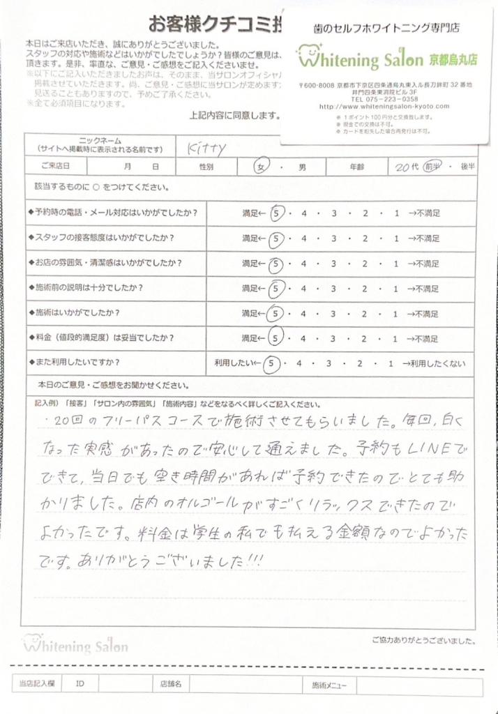 友達からも歯をほめてもらえたり、自信を持って笑えるようになれて、本当に無しいです!スタッフさんもすごく優しくて、色々と気を遣っていただけて通いたくなる、通ってよかったと思えるサロンでした!