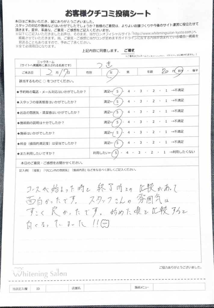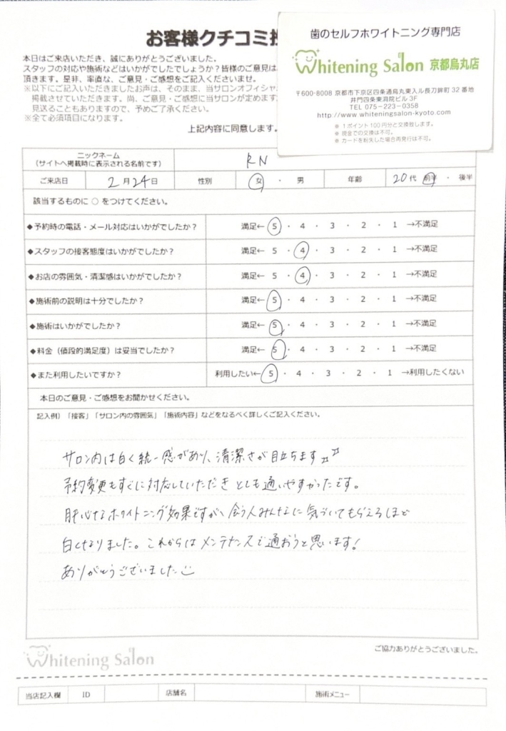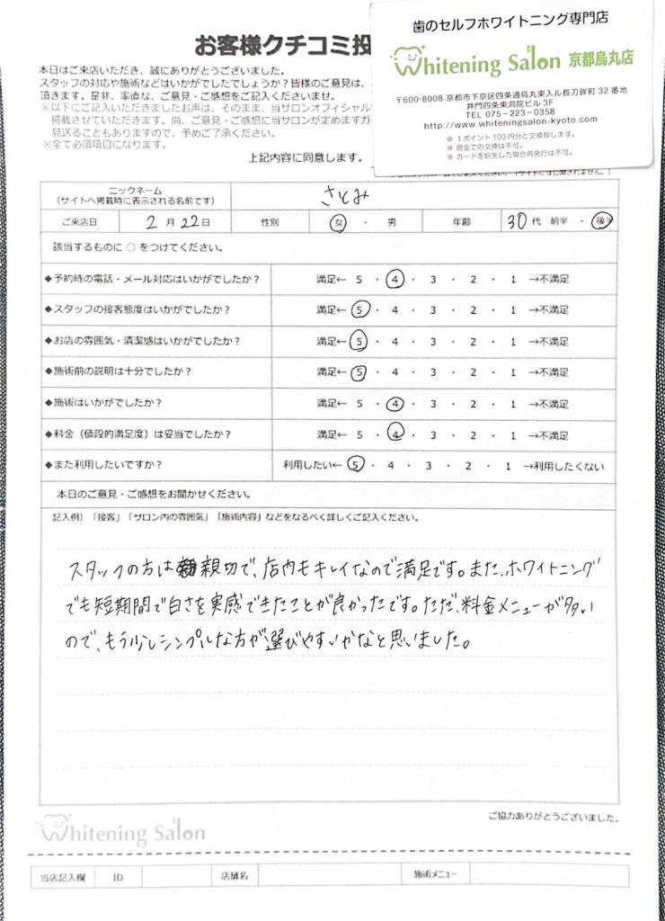 スタッフの方は親切で、店内もキレイなので満足です。また、ホワイトニングでも短期間で白さを実感できたことが良かったです。